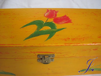 Żółte decu pudełko, ozdobione tulipanami