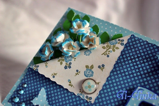 W tej kartce spełnia się moje kolejne „twórcze marzenie” -zawsze chciałam gdzieś zrobić odgięty róg z kwiatami. I w końcu jest! Wyszedł co prawda trochę inny niż sobie wymarzyłam, ale może kiedyś zrobię kolejną- lepszą 😉