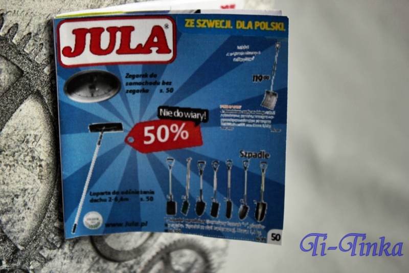 Kartka zawiera specjalną edycję katalogu JULA z rabatem 50% na łopaty.