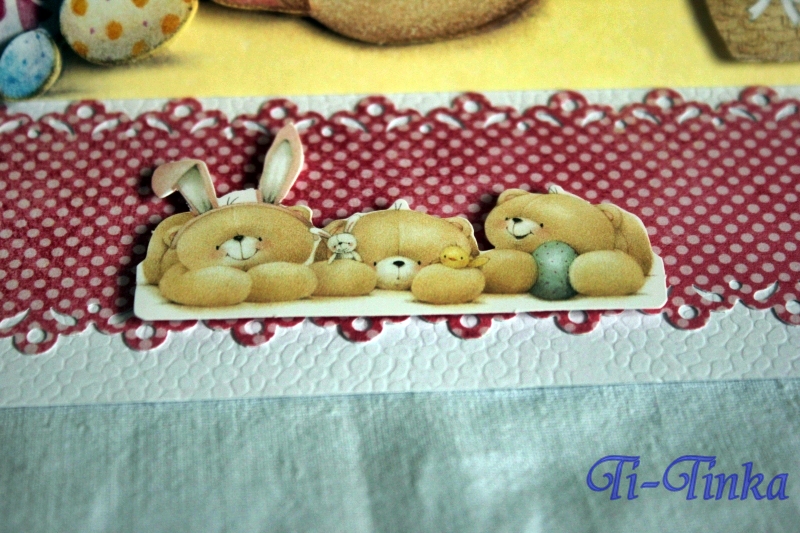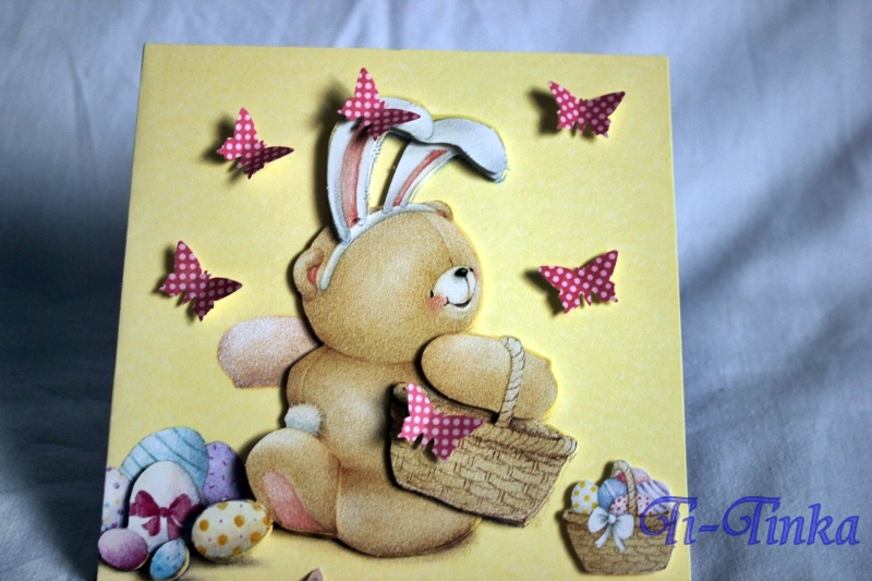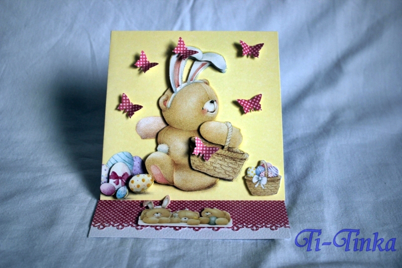 Większość elementów pochodziła z takiego specjalnego zestawu, który leżał u mnie już od dawna. Stwierdziłam, że szkoda, żeby się marnował. Trochę pokombinowałam, głownie z formą kartki i dodałam motylki i powstała taka prosta wesoła karteczka z misiem-zajączkiem 😉