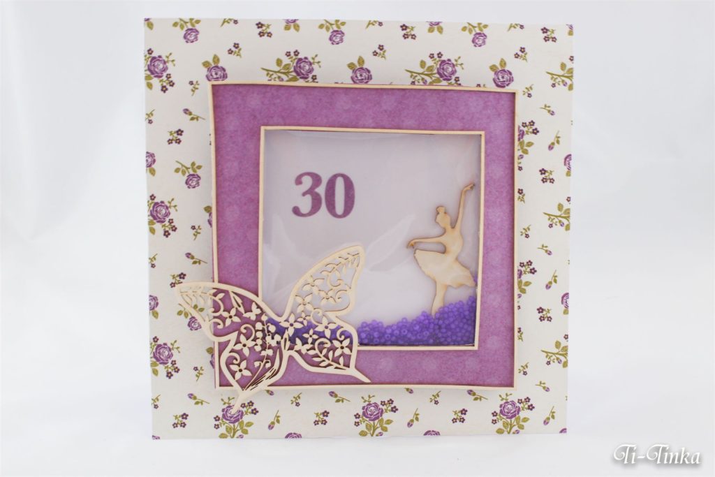 Delikatne biało fioletowe kolory, tekturka ramka z motylkiem, baletnica w środku, a w okół niej przesypujące się fioletowe groszki.