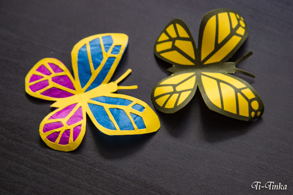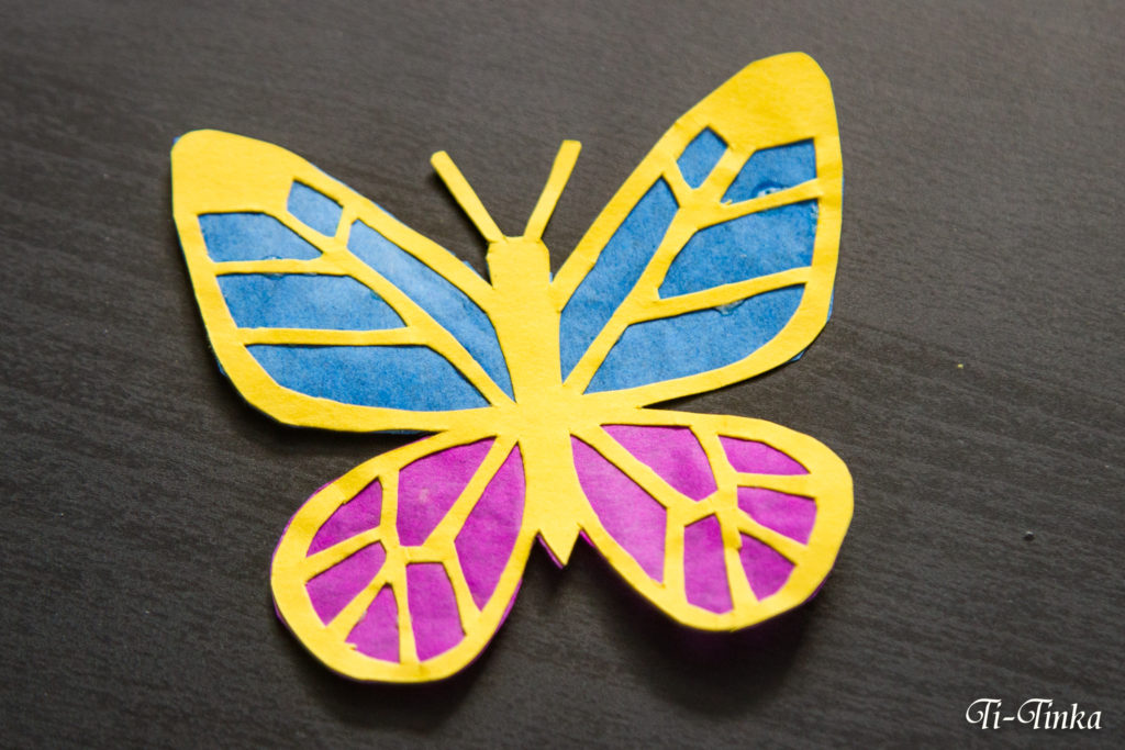 Ażurowego motyla od lewej strony podklejamy kolorową bibułą.
