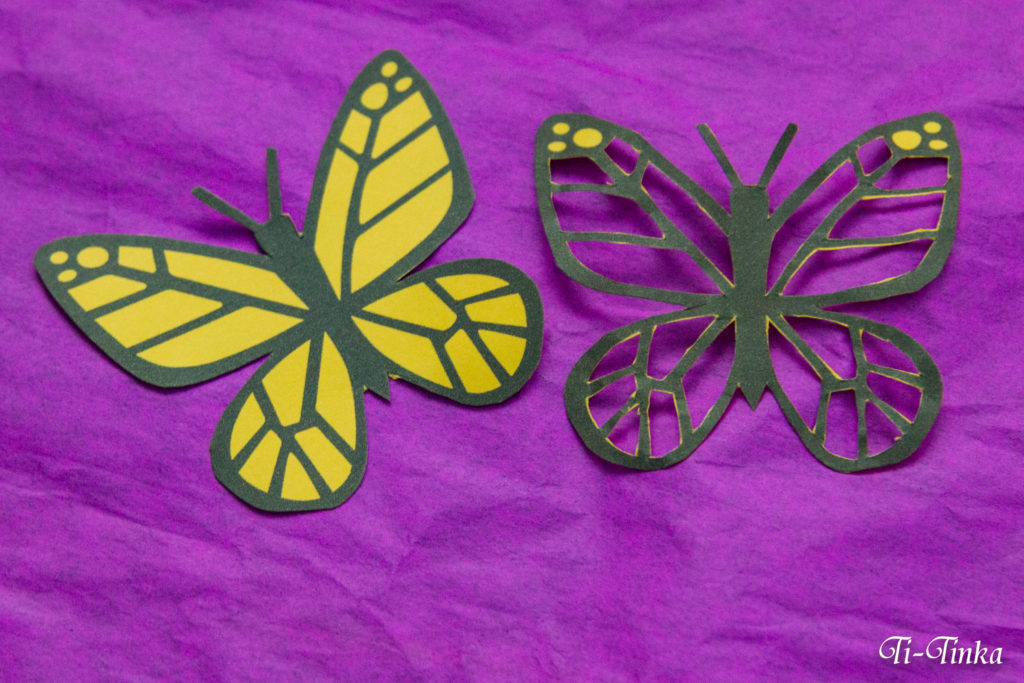 Pierwszego motyla wycinamy tylko po zewnętrzych krawędziach, a w drugim motylu zostawiamy tylko kontury.