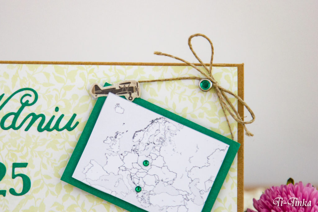 Starałam się więc zróżnicować je kolorystyką, formatem i motywem. Na tej jest mapa Europy, a kryształkami zaznaczyłam Polskę i Albanię, bo właśnie tam aktualnie nasz jubilat mieszka.