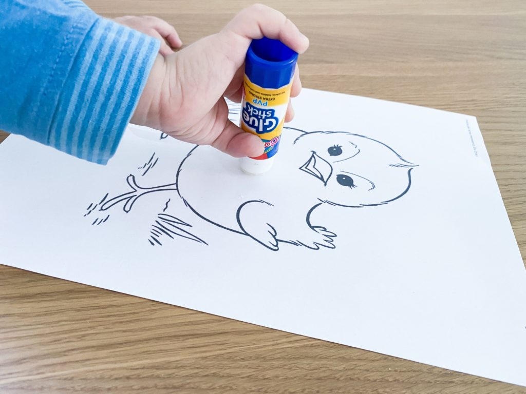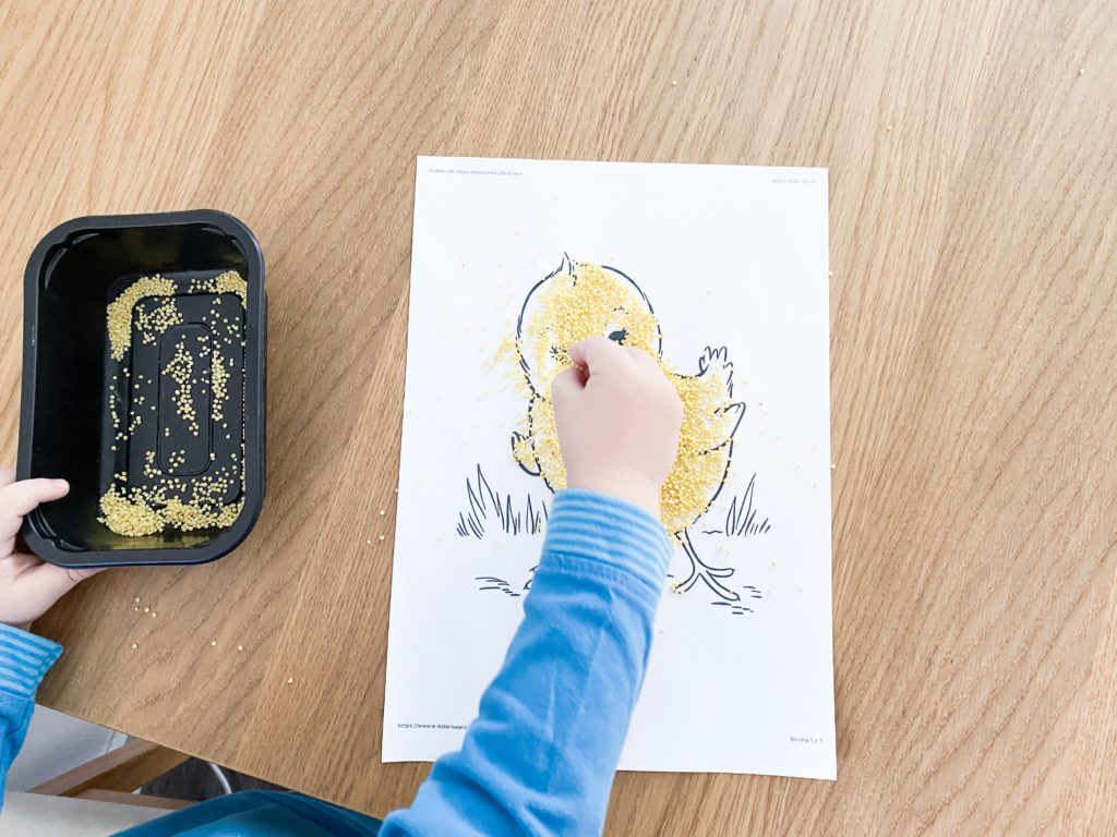 Tym razem stawiamy na zabawy sensoryczne, więc kurczaczka wyklejamy kuszą 🙂