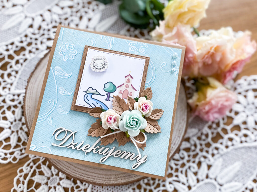 Postawiłam na połączenie papierów eko i turkusowych, dodałam grafikę z kościółkiem i niewielką kompozycję kwiatową.
