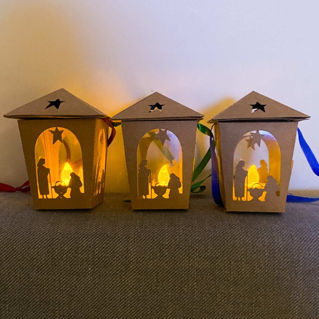 Zrobiłam je z papieru craftowego, z szybkami, a w środku są lampki wyglądające jak świeczki 🙂