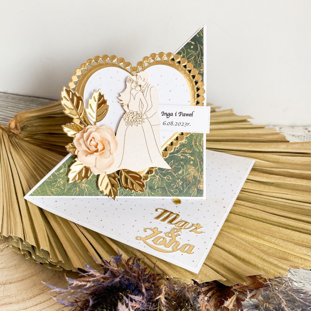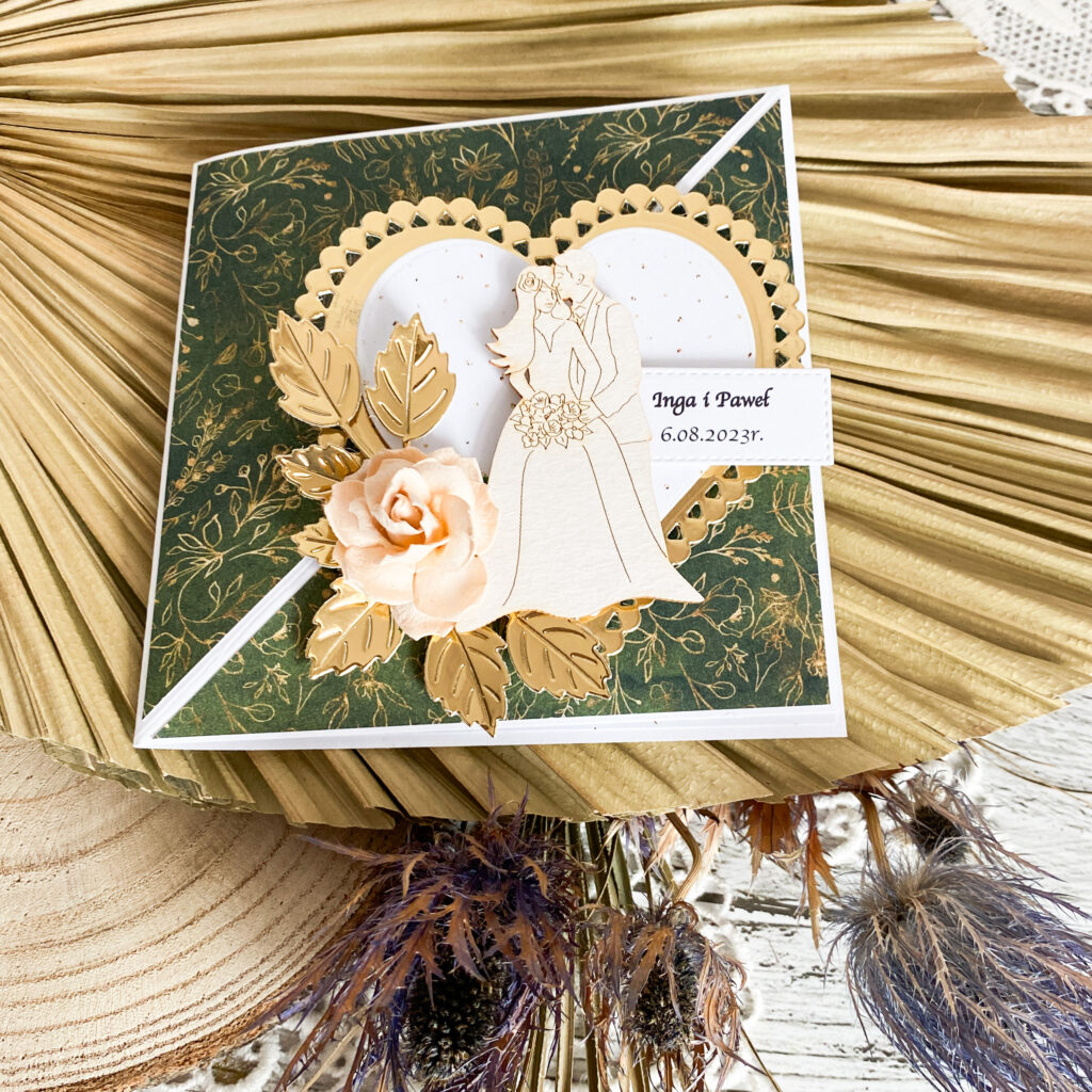 Przed Wami kolejna zielona kartka na ślub – tym razem postawiłam na złote dodatki i niebanalny format.