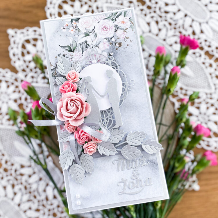 Dzień dobry Kochani,dzisiaj mam dla Was kartkę ślubną w szaro-różowo-srebrnej kolorystyce. Dawno już nie używałam motywu serca, a bardzo go lubię na ślubnych pracach. Kartkę […]